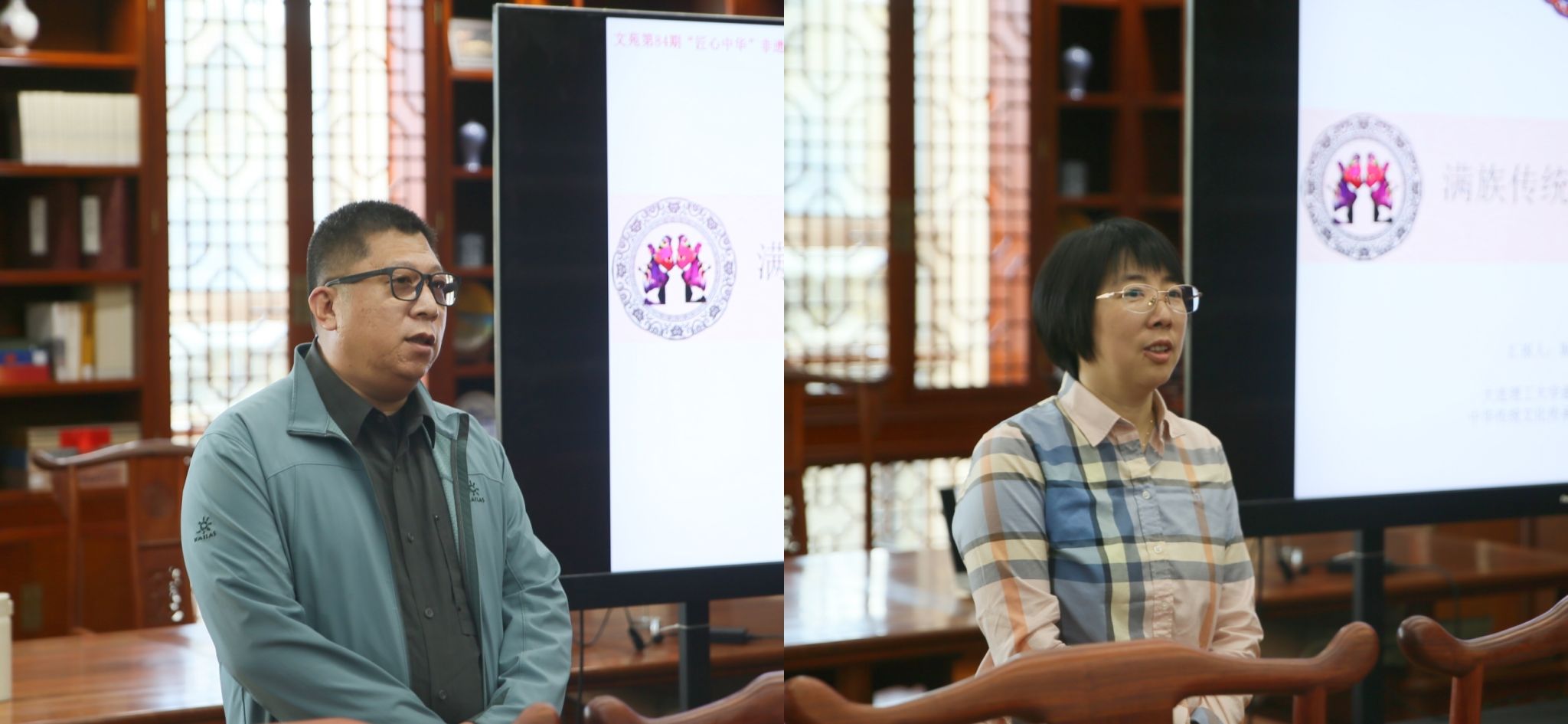 工坊活动分为“文化溯源”与“技艺感受”两个环节。在“文化溯源”环节,耿阳老师为大家讲解了有关满族传统服饰“暖耳”的历史文化,并通过展示清代经典的暖耳刺绣藏品,介绍传统暖耳刺绣纹样的种类与寓意,如鹿纹代表着人们的自然崇拜、葡萄纹象征多子多福的寓意等。