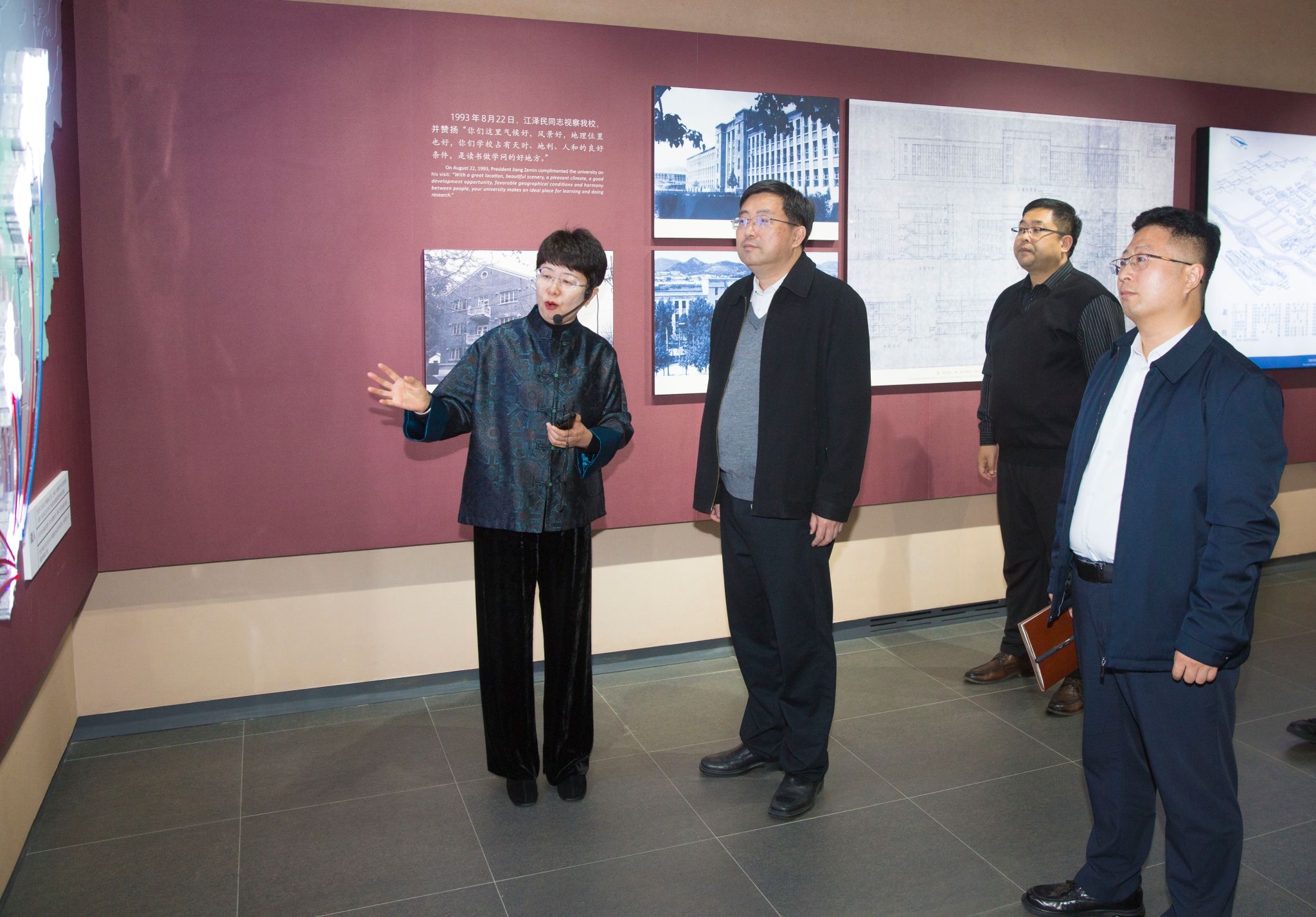 参观过程中,高翔认真听取了校史讲解,详细了解了学校发展的历史沿革、里程碑事件以及在人才培养、教育教学、学科专业、师资队伍、文化建设、开放办学等方面的发展情况。从解放前夕的艰苦创业,到如今争创世界一流;从历经沧桑的学校旧址旧舍,到现在“一校两地三区”办学格局;从师生自力更生建造主楼,到校园日新月异、凌水湖落成,高翔时不时驻足停留,走近端详珍贵的历史照片、文献资料和实物展品,并详细询问交流,回望学校风雨历程,汲取精神力量。