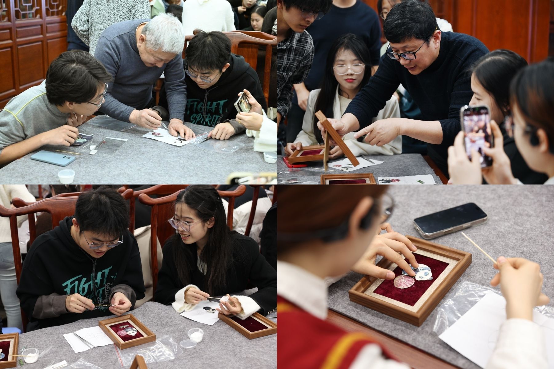 实践环节,金阿山、金吉现场展示贝雕制作的核心技艺,从筛选雕磨到镶嵌堆贴,每一步骤都彰显着创作者的匠心独运。在两位非遗传人的指导下,同学们也纷纷拿起材料包,从基础的色彩搭配、图案布局与粘贴技巧开始,制作出属于自己的艺术作品,沉浸感受贝雕工艺的独特魅力。