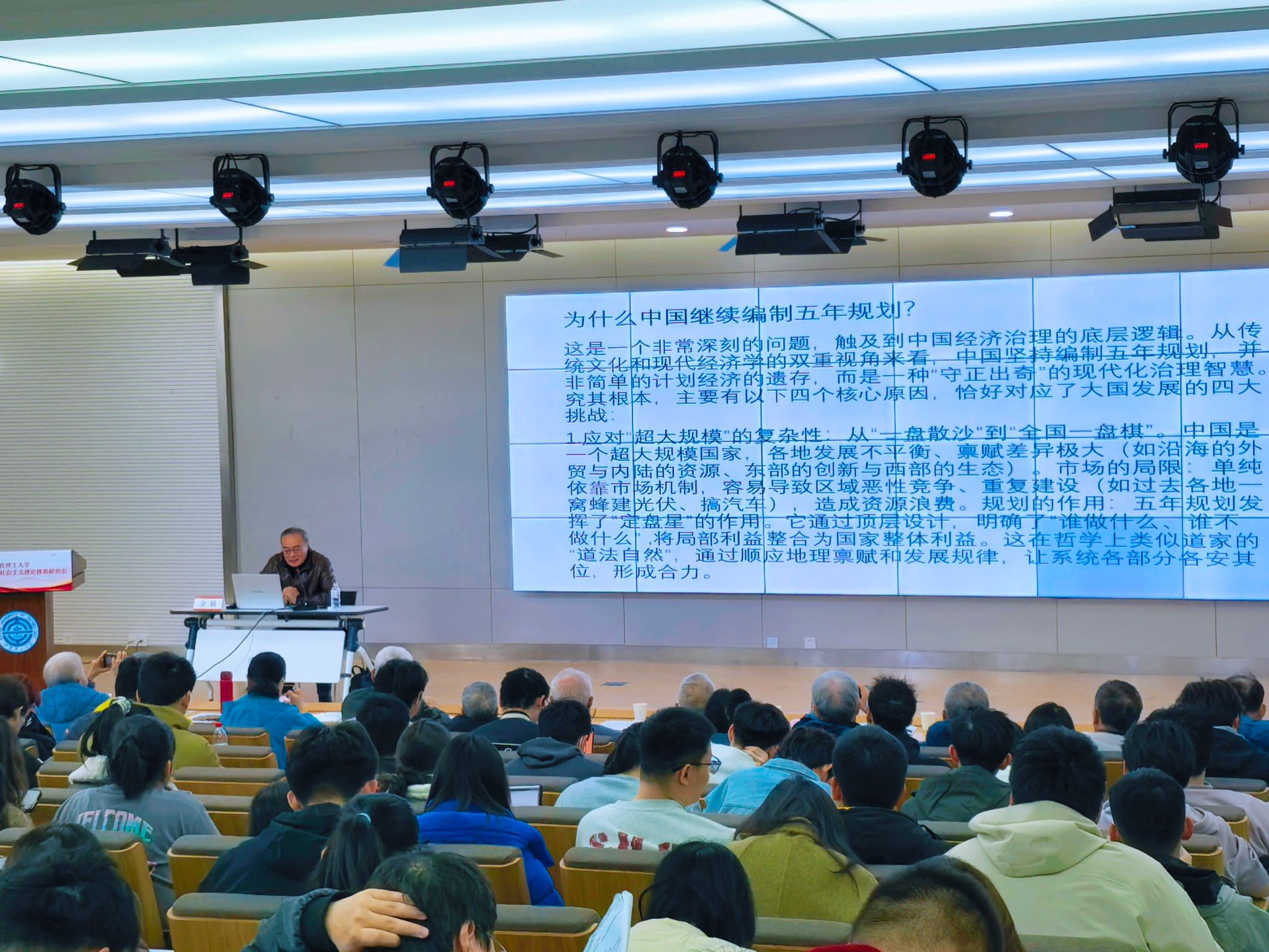 在全国两会精神解读环节,金镝结合2026年政府工作报告,介绍了稳经济、抓创新、保就业、惠民生、守安全等方面的重点内容,并围绕经济增速、就业岗位、物价运行、新质生产力等内容进行了梳理,帮助同学们了解当前国家发展的重点方向。在讲解中国现行制度时,金镝教授从政治制度、社会制度和经济制度三个方面进行介绍,帮助同学们从制度层面理解中国经济社会发展的基本框架。围绕宏观经济相关内容,报告还结合总供给与总需求、经济均衡、供给侧结构性改革等概念,对当前经济运行中的一些基本问题作出了说明。结合中国经济发展实际,金镝教授分析了我国在经济总量增长、人均GDP提升、产业转型升级等方面的发展情况,也谈到了需求不足、转型压力、风险防控和外部环境变化等现实挑战。围绕“为什么坚持五年规划”这一问题,报告从国家治理规模大、区域发展不平衡、市场存在短期性和局部失灵等角度展开说明,让大家对五年规划在国家发展中的作用有了进一步的认识。此外,报告还结合具体案例与传统文化相关内容,围绕青年如何看待时代变化、如何处理个人发展与国家发展的关系展开延伸交流,引导大家将理论学习与现实思考结合起来。