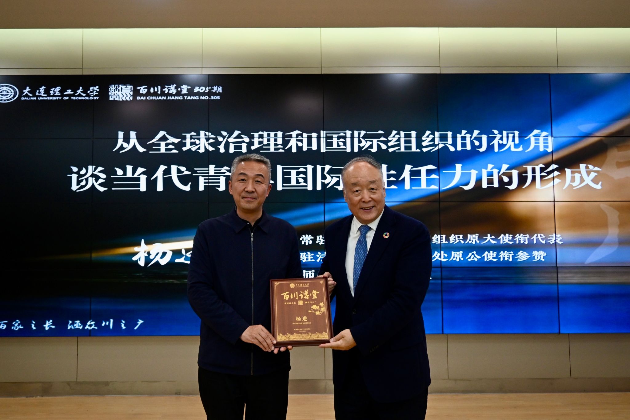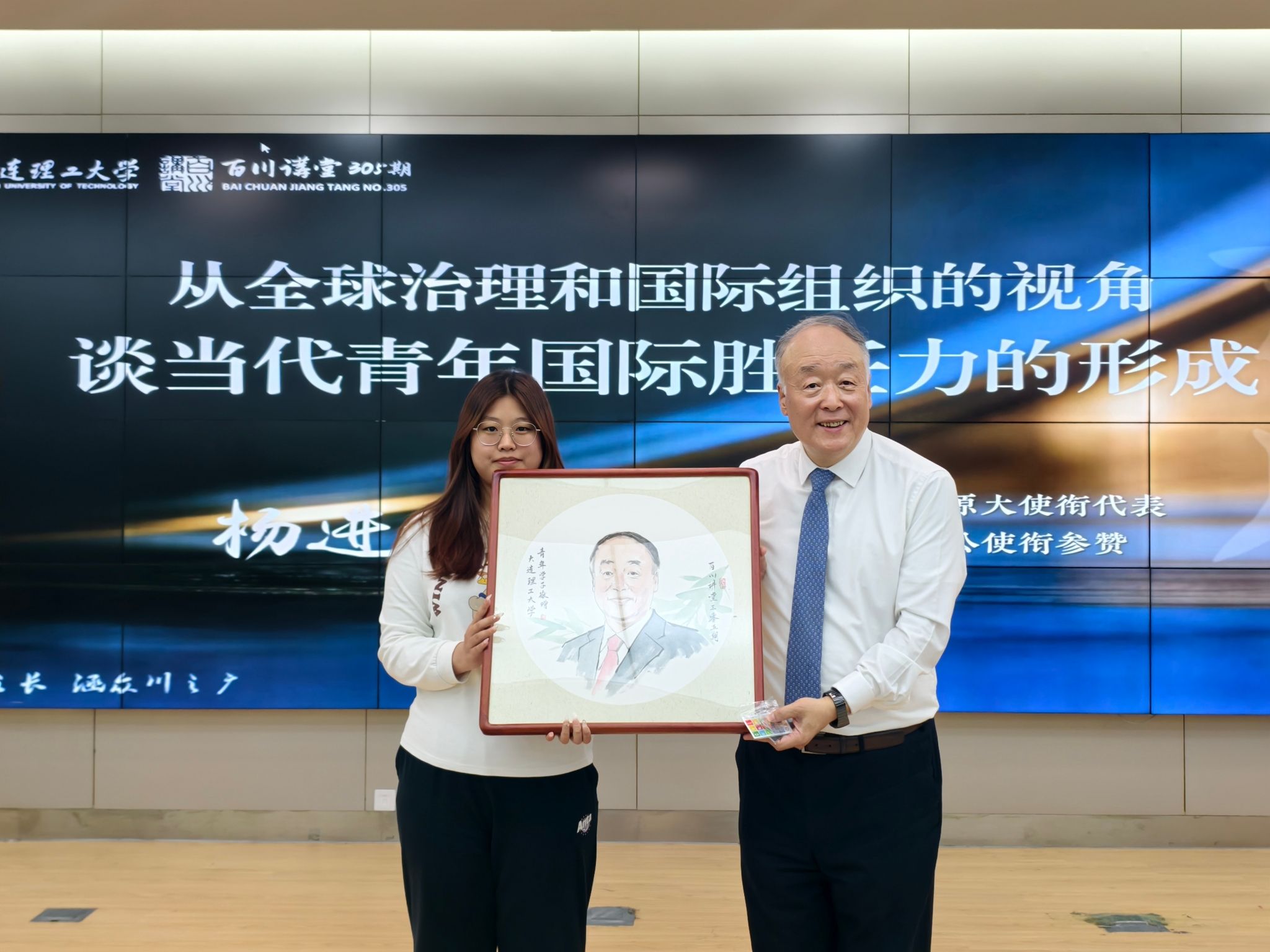 康旭东代表学校为杨进颁发“百川讲堂”牌匾,学生代表赠送国画肖像,以表感谢与敬意。