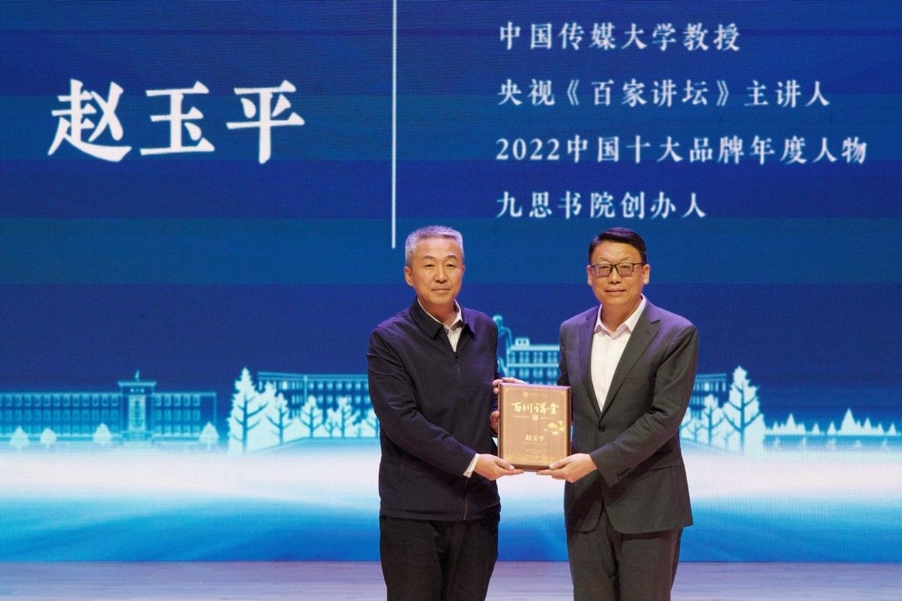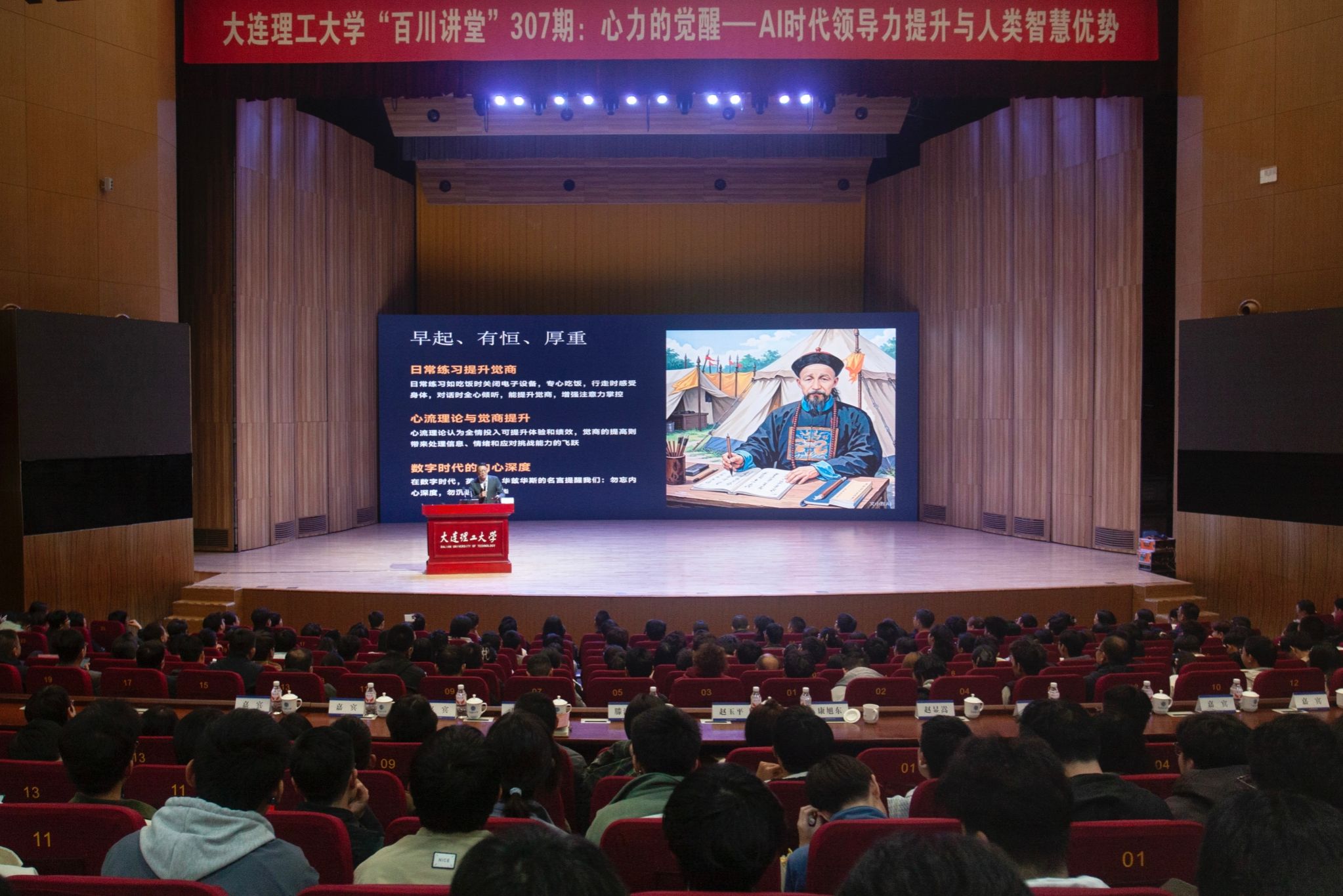 智潮奔涌,心力为锚;时代更迭,领创为光。4月13日,中国传媒大学教授、央视《百家讲坛》主讲人、2022中国十大品牌年度人物、九思书院创办人赵玉平做客我校“百川讲堂”第307期,带来主题为《心力的觉醒:AI时代领导力提升与人类智慧优势》的讲座。副校长康旭东,校团委书记赵显嵩,以及来自校内各单位、各学院及书院的师生、百川会员等共计600余人到场聆听讲座。