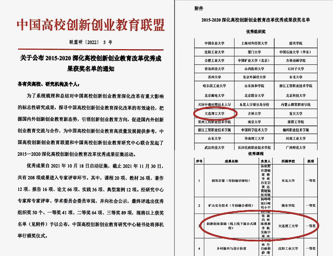 8月23日,中国高校创新创业教育联盟公布“2015-2020深化高校创新创业教育改革优秀成果获奖名单”,我校创新创业学院创新创业教育教研室张崴团队建设的线上线下混合式课程《创新创业基础》获优秀课程一等奖,张崴老师和冯林教授主编的《创意设计与专利保护》获优秀教材三等奖。我校获优秀成果组织奖。