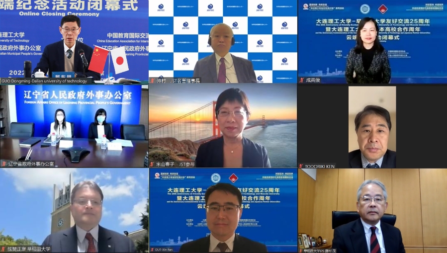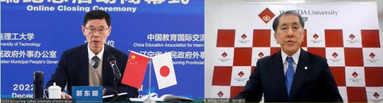 12月15日,大连理工大学(以下简称“大工”)与早稻田大学(以下简称“早大”)友好交流25周年纪念活动暨大工与日本高校合作周年云端纪念活动闭幕式顺利举办。中华人民共和国驻日本国大使馆特命全权大使孔铉佑、日本国驻中华人民共和国大使馆特命全权大使垂秀夫、中国教育国际交流协会秘书长王永利、日本科学技术振兴机构名誉理事长冲村宪树、日本国驻沈阳总领事馆常驻大连领事办公室首席代表等等力研、辽宁省人民政府外事办公室亚洲处处长胡元元、大连市人民政府外事办公室主任成英俊,早稻田大学校长田中爱治、副校长弦间正彦,我校校长郭东明,两校国际交流管理部门及经济管理、建筑与艺术、信息与软件、日语等相关学科师生代表出席。