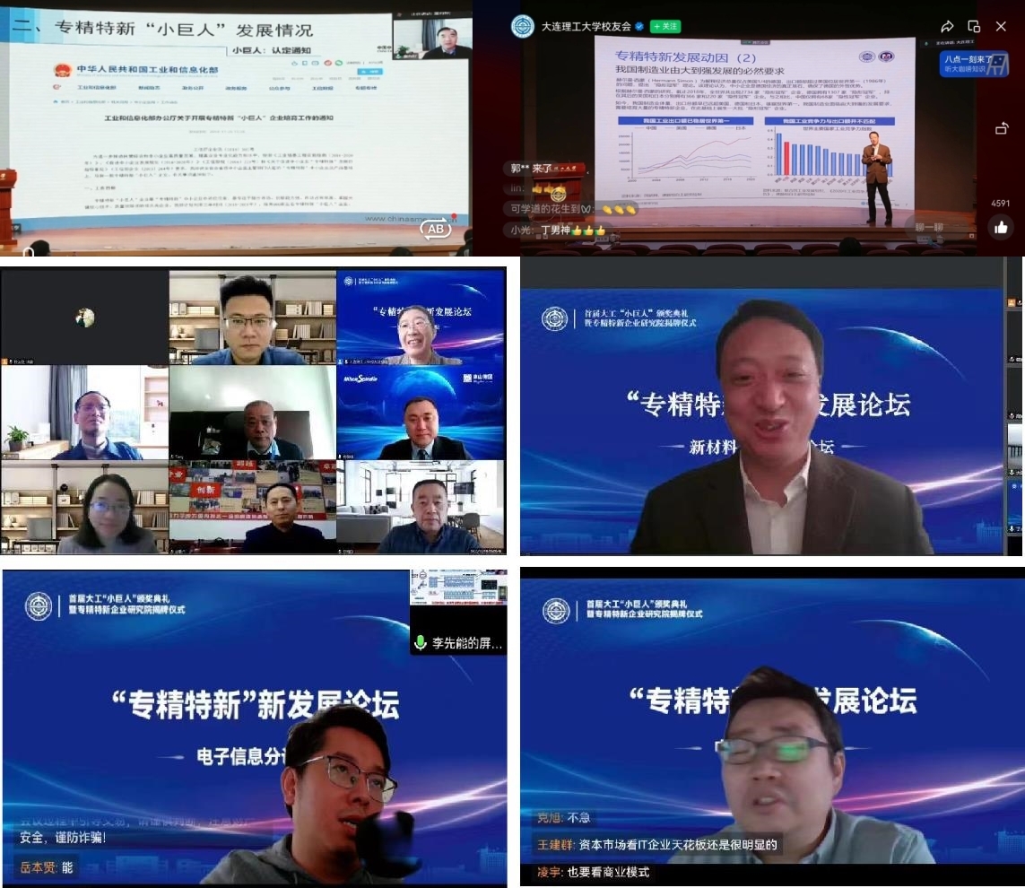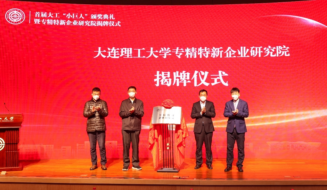 郭东明为26家获奖校友企业颁奖。张言军宣读首届大工“小巨人”获奖企业名单以及专精特新企业研究院任命决定,聘任张志宏为院长,杨克旭、科学技术研究院院长王博、经济管理学院党委书记孙玉涛为副院长。郭东明、张言军、张志宏、王博、杨克旭共同为我校专精特新企业研究院揭牌。王博代表专精特新企业研究院与大连金普新区“专精特新”孵化器基地代表陈志刚线上签署合作协议。