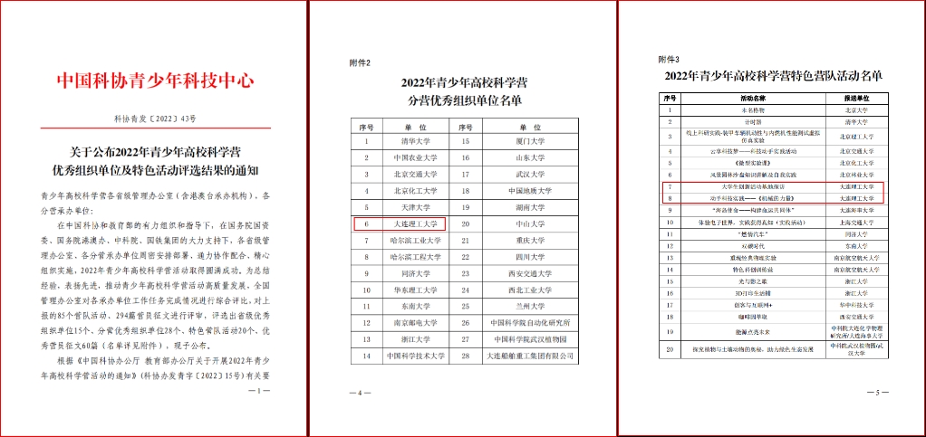 近日,中国科协公布了2022年青少年高校科学营优秀组织单位及特色活动评选结果,评选出省级优秀组织单位15个、分营优秀组织单位28个、特色营队活动20个。我校获评分营优秀组织单位,是辽宁省唯一获评的高校,另有两项活动获评特色营队活动。