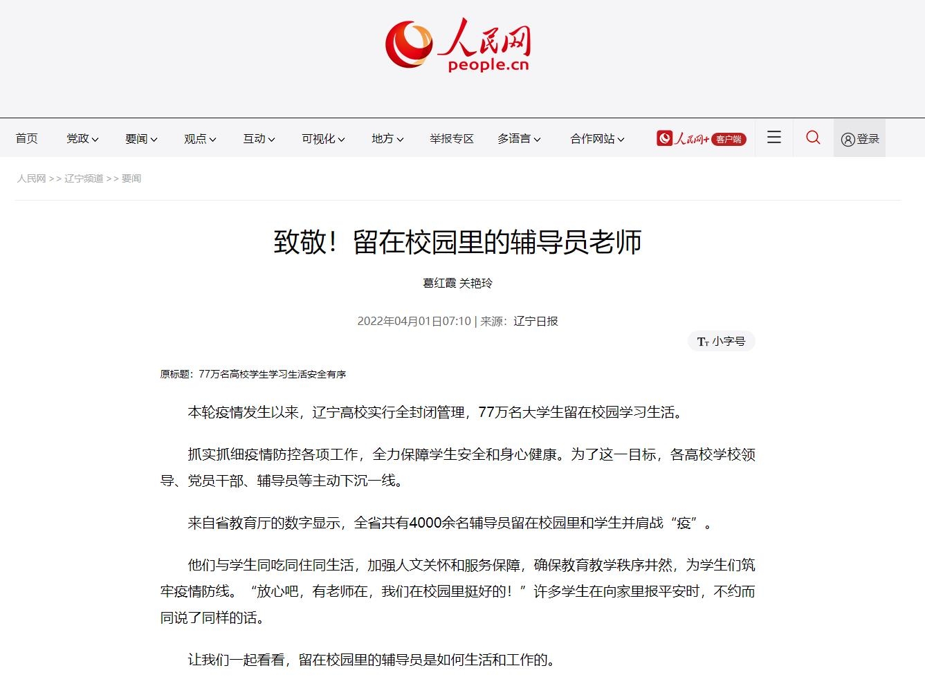 4月1日,人民网报道了我校在抗击疫情期间,留在校园里的辅导员是如何生活和工作的,展现了辅导员老师的责任与担当。