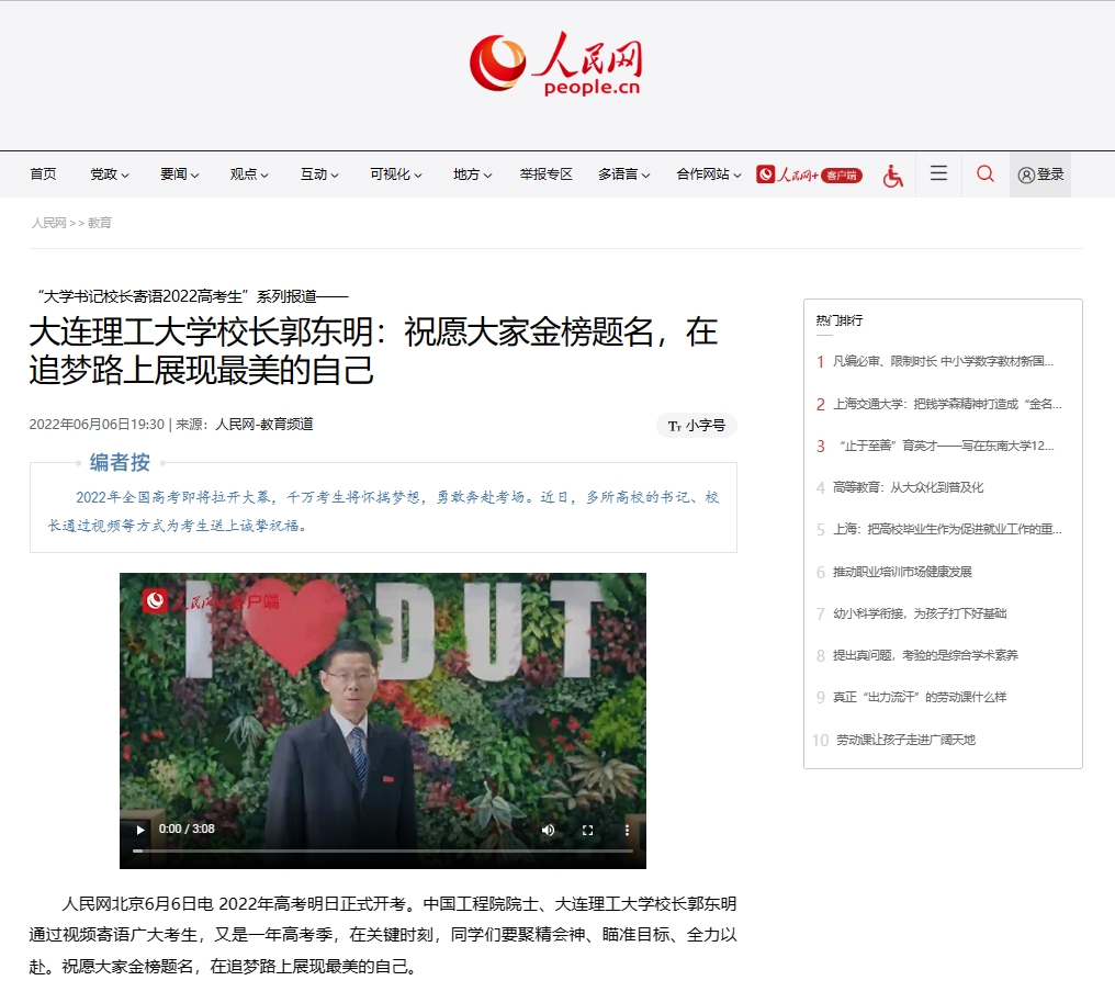 6月6日,人民网报道我校郭东明校长以视频方式为高考学子送上诚挚祝福并介绍学校状况。