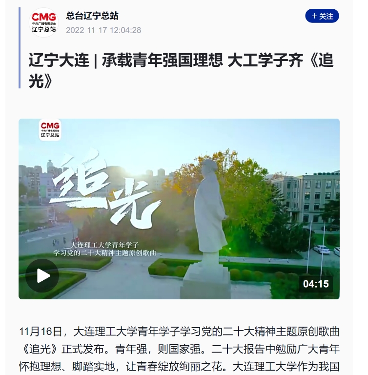 11月18日,我校青年学子学习党的二十大精神主题原创歌曲《追光》正式发布。中央电视台对此进行报道。