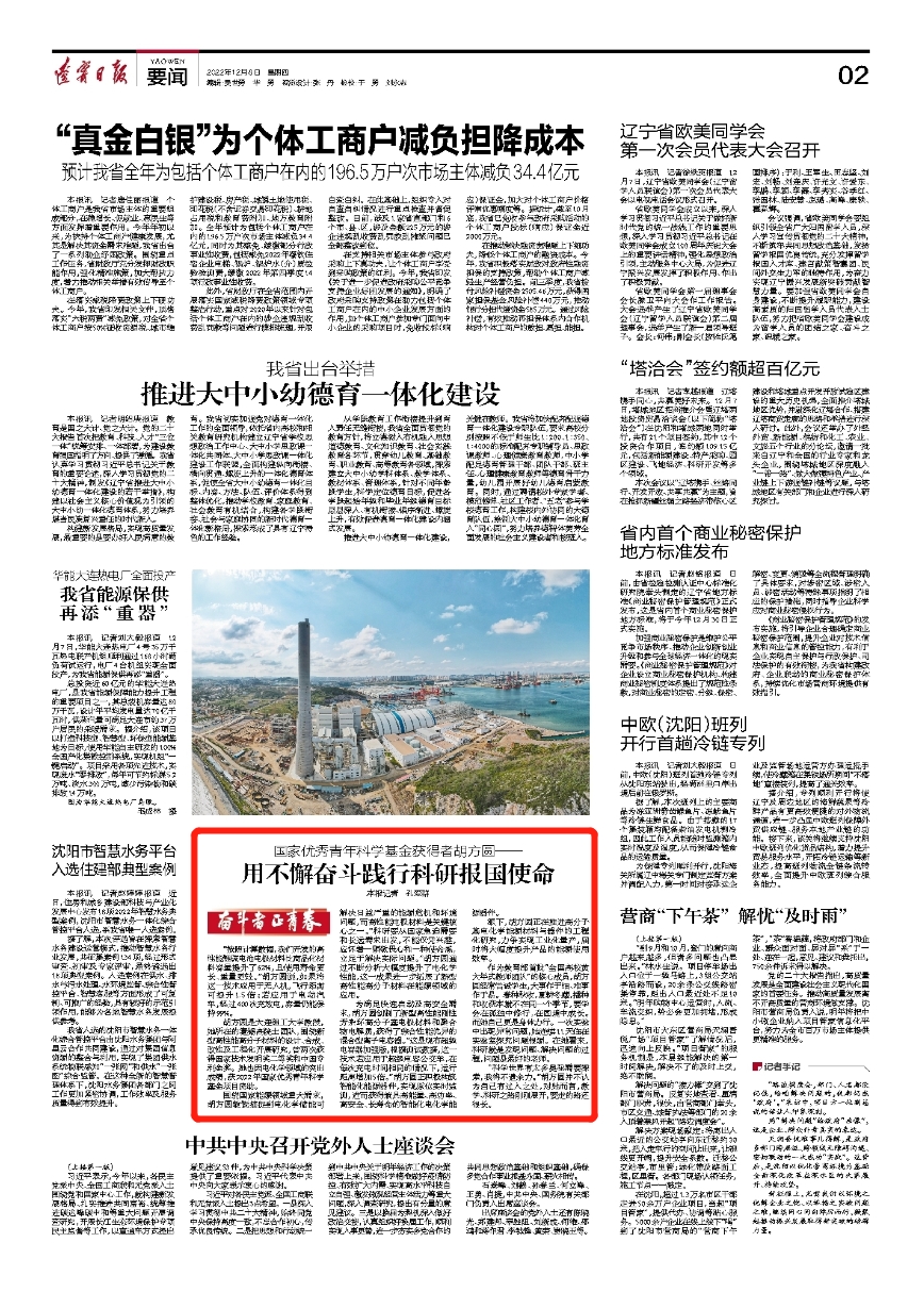 12月8日,《辽宁日报》02版报道了材料与科学学院胡方圆教授科研报国的故事。