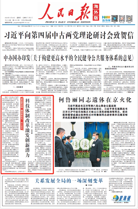 3月24日,《人民日报》头版发布文章,其中推介了我校深化科技体制改革做法。