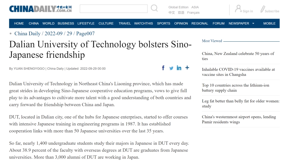 9月29日,《China Daily》《中国日报》出版了“2022中日邦交正常化五十周年特刊”,其中7版报道了我校国际信息与软件学院中日合作办学成果。