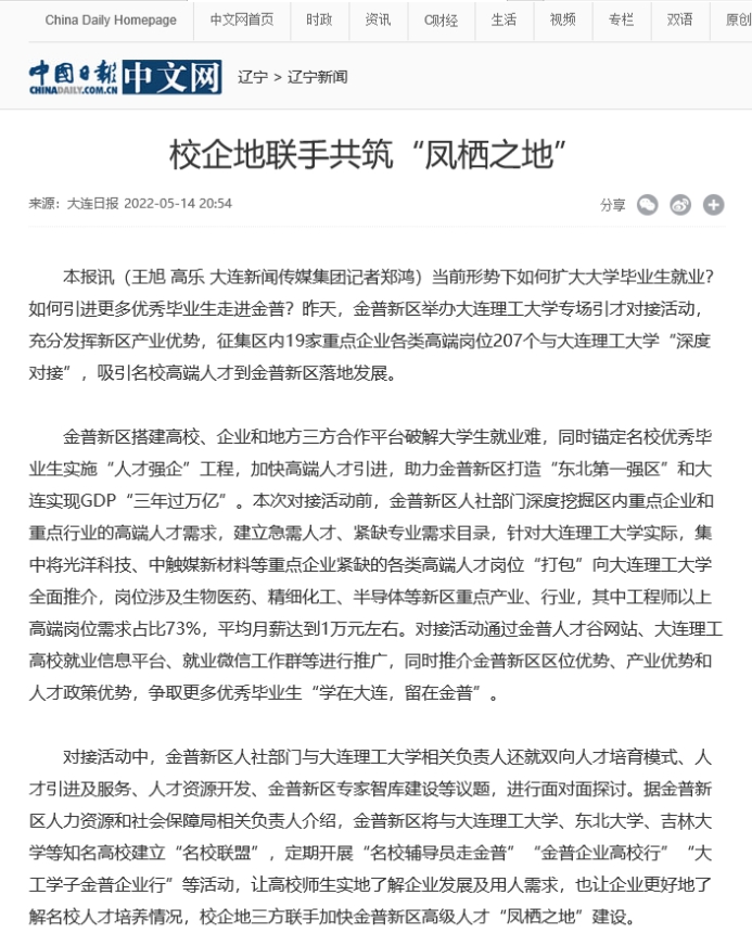 5月14日,中国日报网报道大连理工大学专场引才对接活动在金普新区举行,校企地三方联手加快金普新区高级人才“凤栖之地”建设。