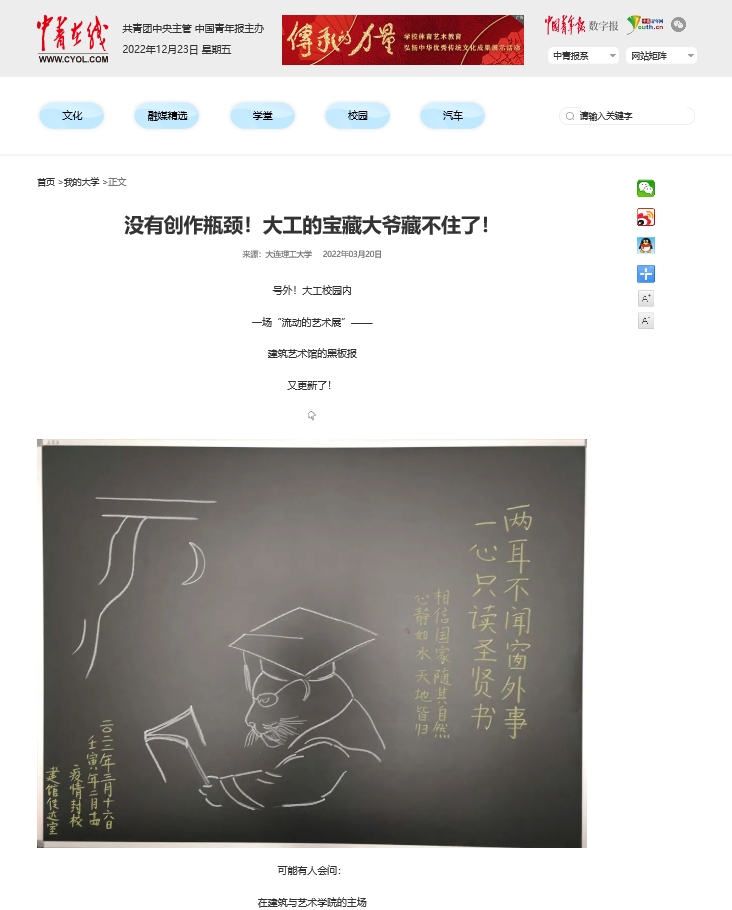 3月20日,中青在线以《没有创作瓶颈!大工的宝藏大爷藏不住了!》为题,报道了我校建艺学院传达室大爷通过黑板报的形式,鼓舞同学们战胜疫情带来的负能量。