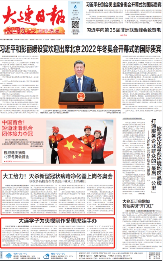 2月6日,《大连日报》头版对我校老师科研成果和学生设计助力冬奥进行报道。