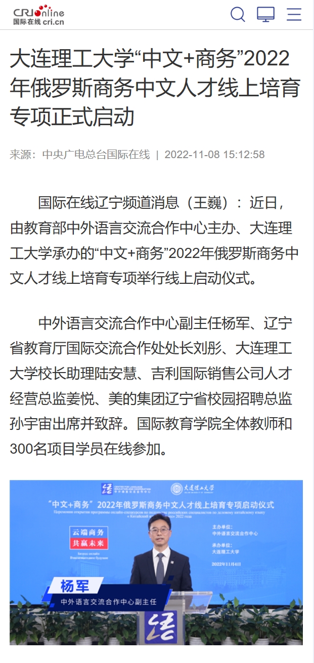 11月8日,由我校承办的“中文+商务”2022年俄罗斯商务中文人才线上培育专项活动举行线上启动仪式。中央广电总台国际在线对此进行报道。