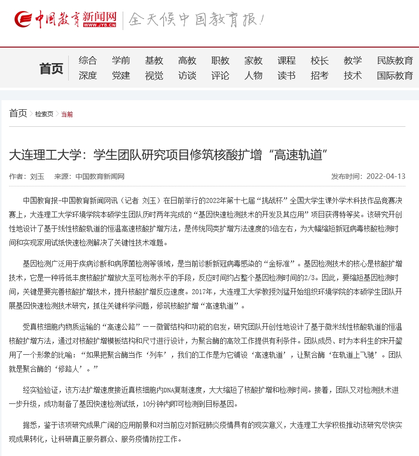 4月13日,中国教育新闻网报道,我校环境学院本硕学生团队的“基因快速检测技术的开发及其应用”项目获得“挑战杯”全国大学生课外学术科技作品竞赛特等奖。