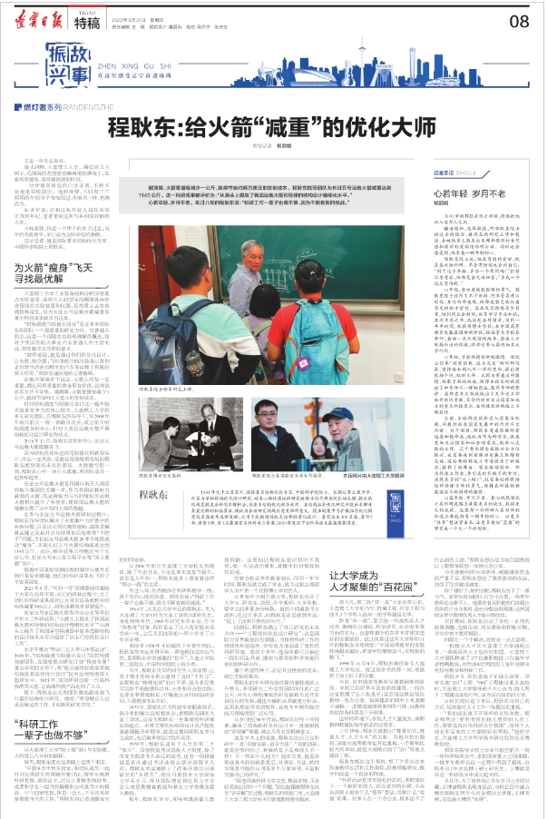 3月31日,《辽宁日报》整版讲述了我校程耿东院士“科研工作一辈子也做不够”的奋斗故事《程耿东:给火箭“减重”的优化大师》。