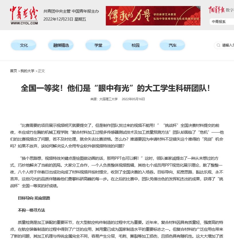 5月16日,中青在线报道我校学生科研团队事迹,在“大国重器”研究制造过程中贡献力量。