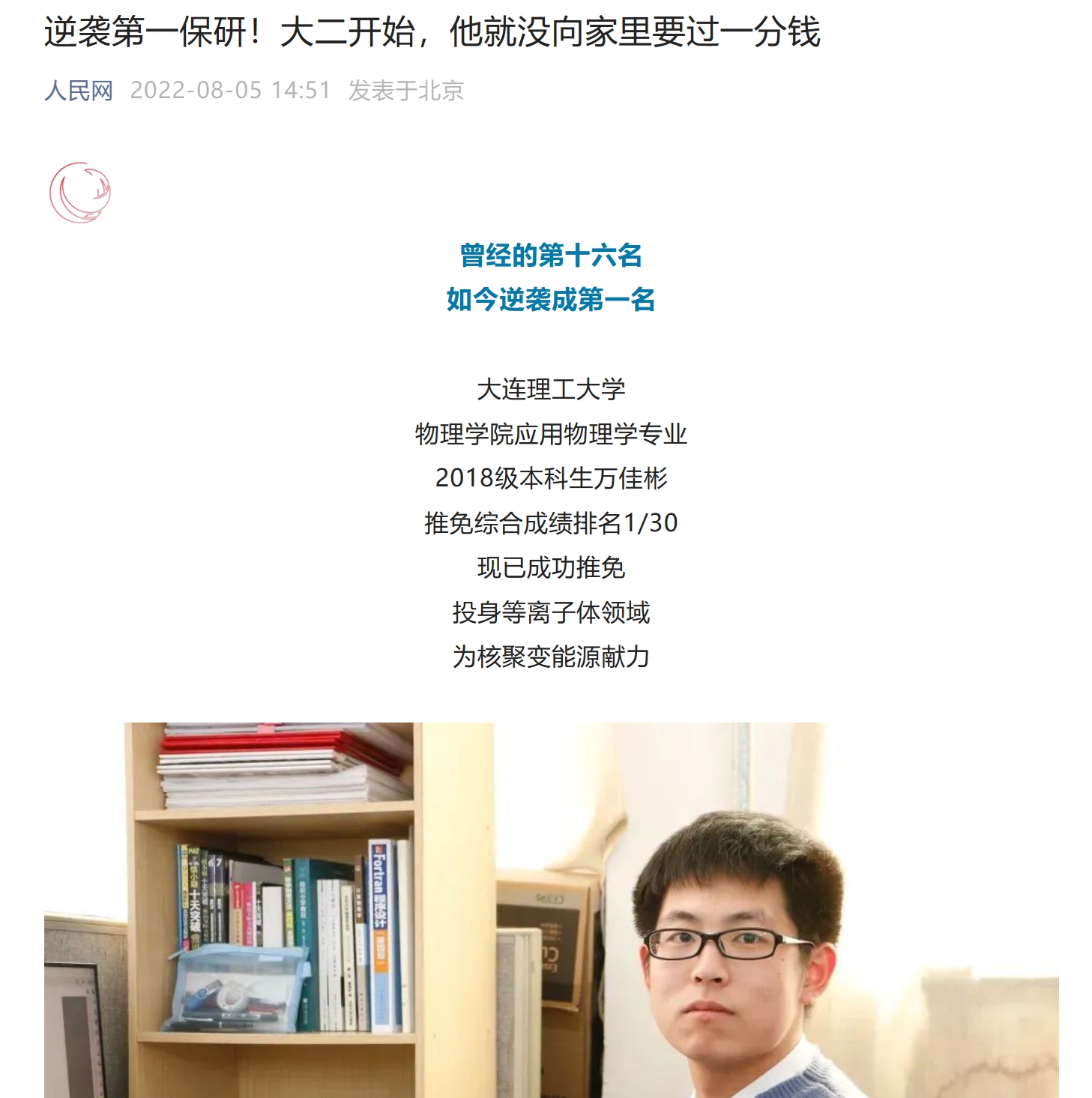 8月5日,人民网官方微信推送文章,向大家讲述了我校应用物理学专业学生万佳彬的逆袭之路。