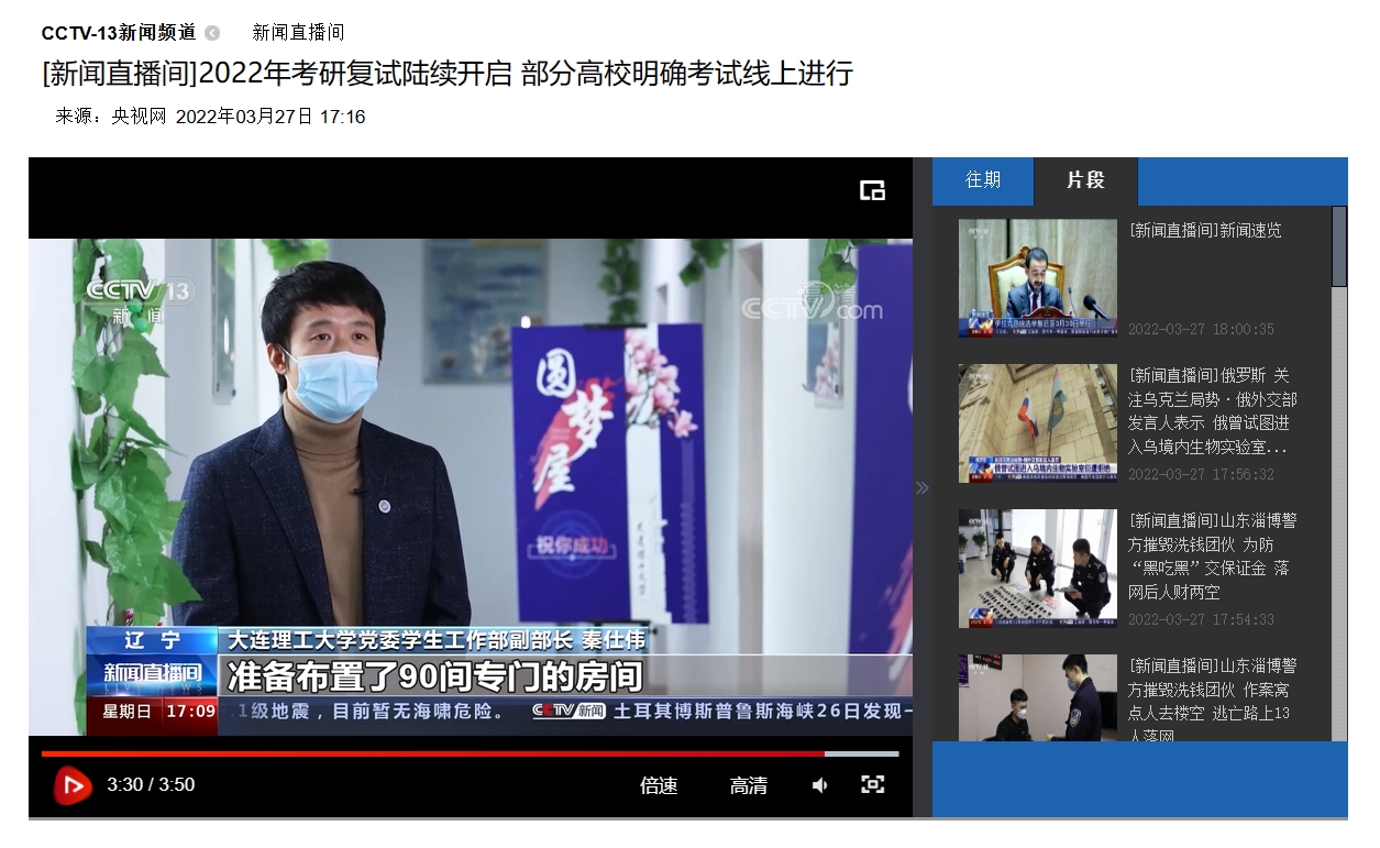 3月27日,央视新闻报道我校为学生设立网上复试专用室“圆梦屋”,为学生们考研复试和求职助力护航。