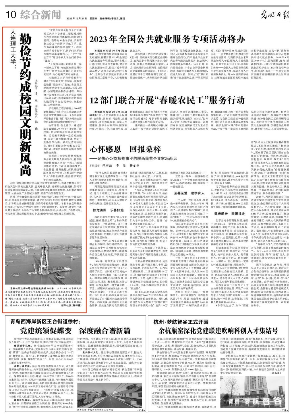 12月21日,《光明日报》10版报道大连理工大学将劳动教育与建设“节约型食堂”相结合,在各食堂设置“劳动育人”基地,开设劳动课,通过劳动实践引导学生主动劳动、尊重劳动、以劳动为荣。