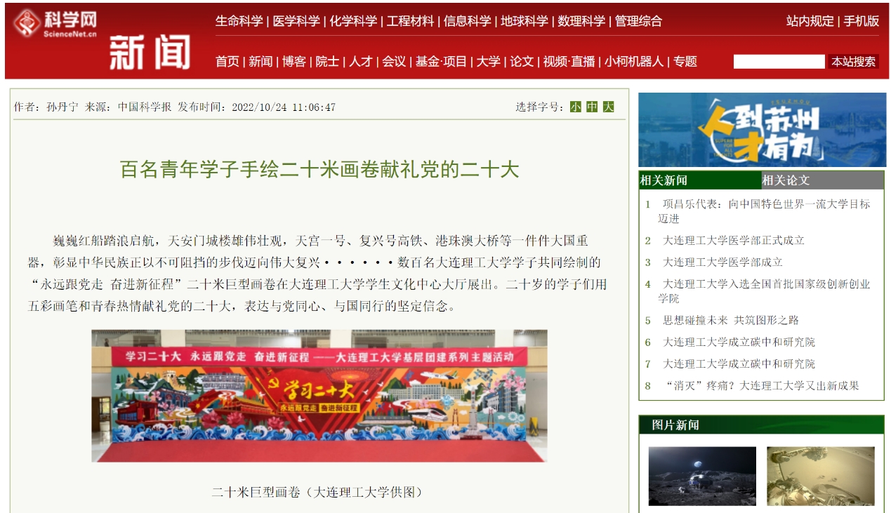 10月27日,我校百名学子共同绘制“永远跟党走 奋进新征程”二十米巨型画卷献礼党的二十大,表达与党同心、与国同行的坚定信念。科学网对此进行了深入报道。