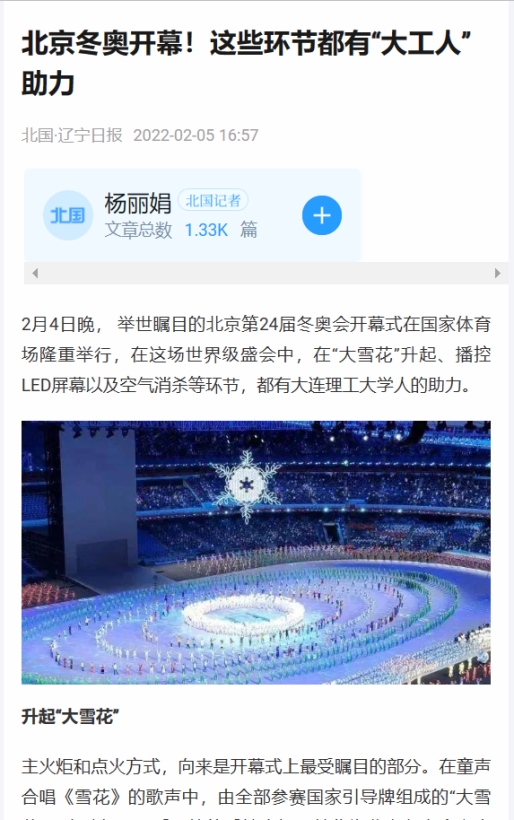 2月5日,辽宁日报客户端报道北京冬奥会开幕式中的“大工力量”——北京冬奥会开幕,这些环节都有“大工人”助力。