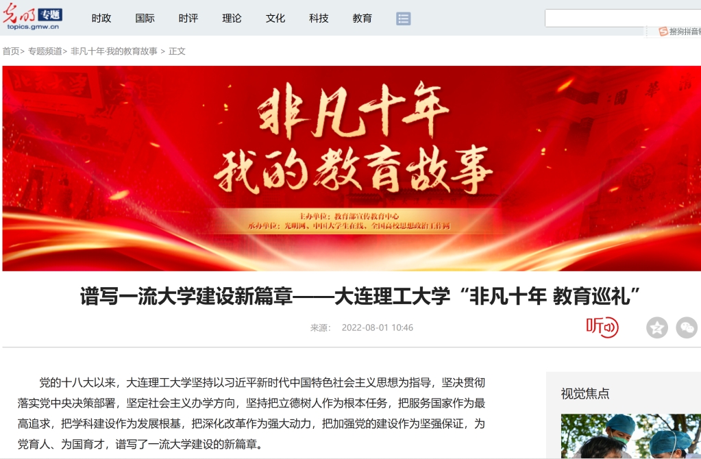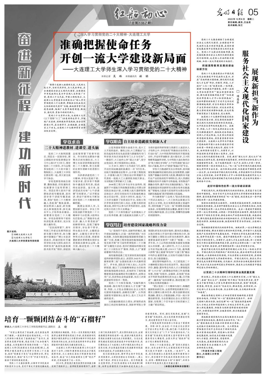 10月18日,《光明日报》特刊报道了党的二十大代表、中国工程院院士、大连理工大学党委书记项昌乐的参会手记——向中国特色世界一流大学目标迈进。