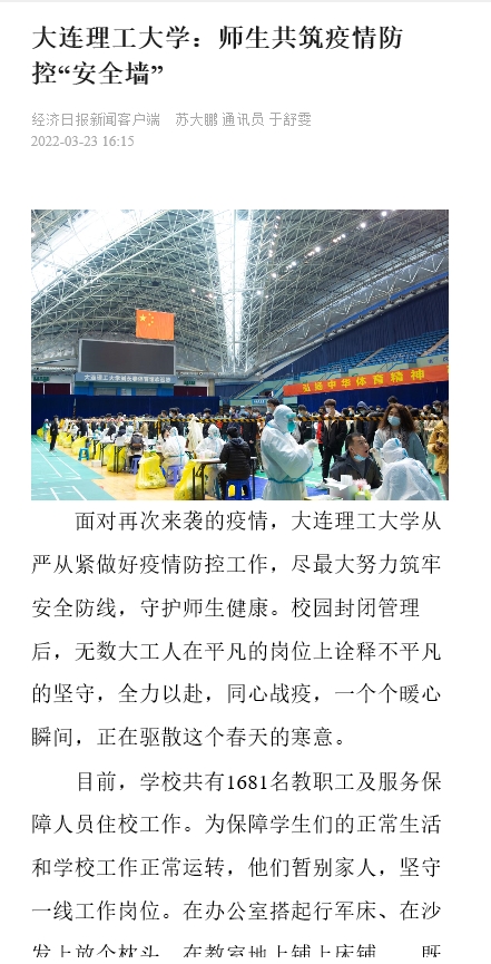3月23日,面对再次来袭的疫情,我校从严从紧做好疫情防控工作,尽最大努力筑牢安全防线,守护师生健康。无数大工人在平凡的岗位上诠释不平凡的坚守,全力以赴,同心战“疫”。经济日报客户端对此进行了报道。