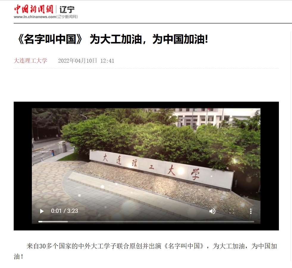 4月10日,中国新闻网发表视频,来自30多个国家的中外大工学子联合原创并出演《名字叫中国》,为大工加油,为中国加油!