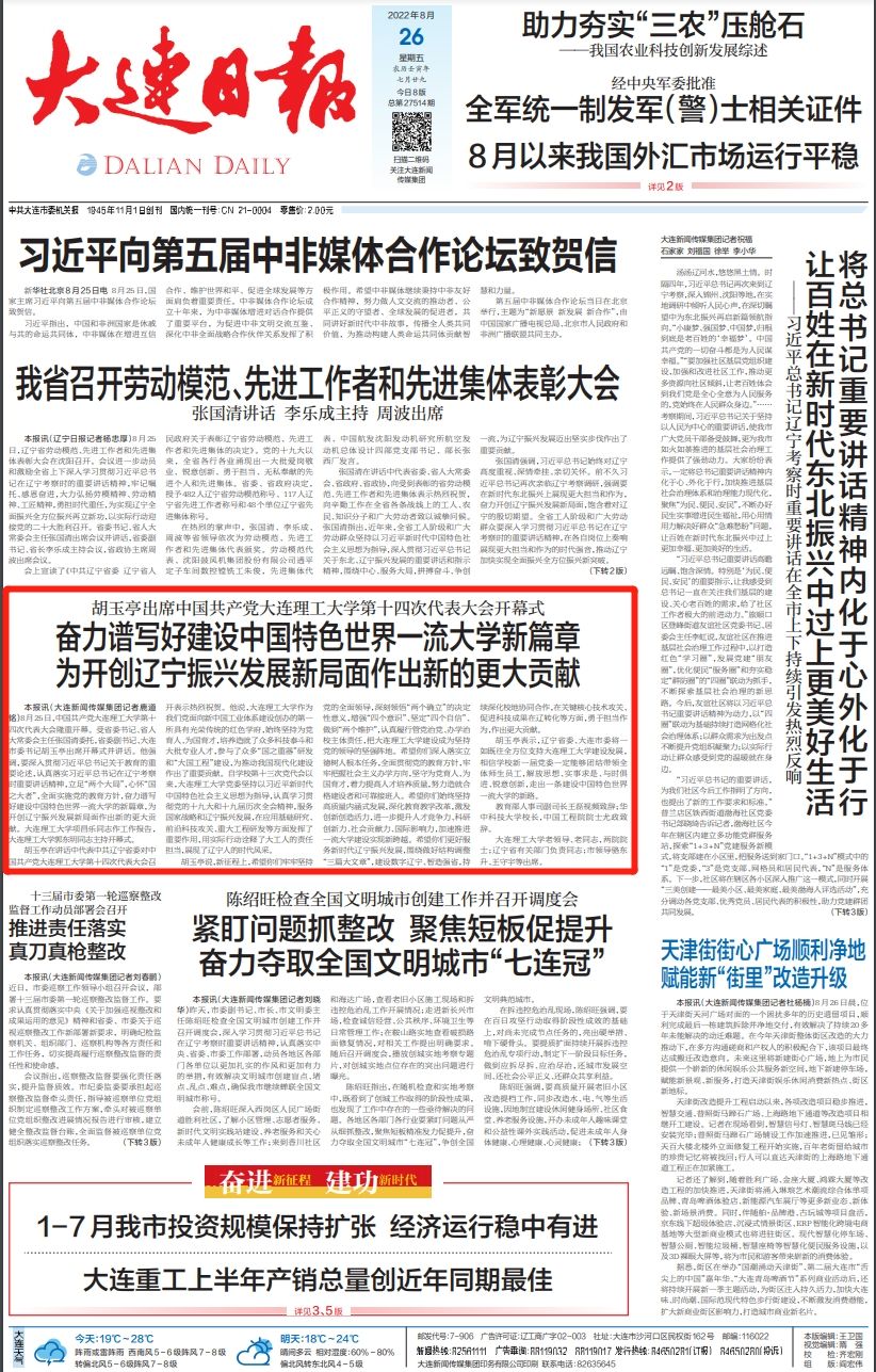 8月26日,《辽宁日报》《大连日报》头版报道我校第十四次代表大会召开。
