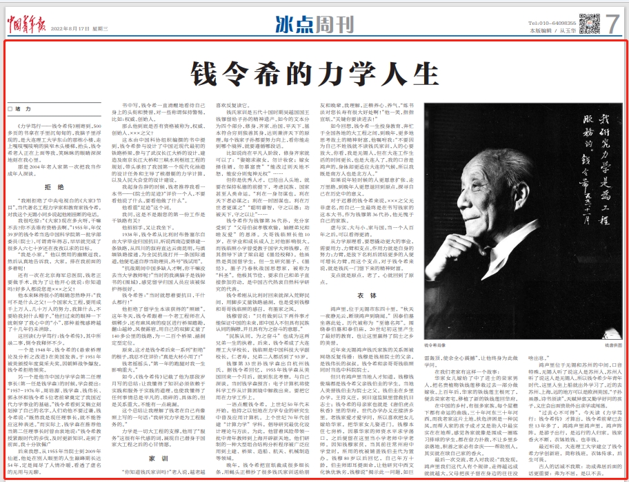 8月17日,《中国青年报》刊登通讯文章《钱令希的力学人生》。“评价一个人,不要看他说了什么,要看他做了什么。”