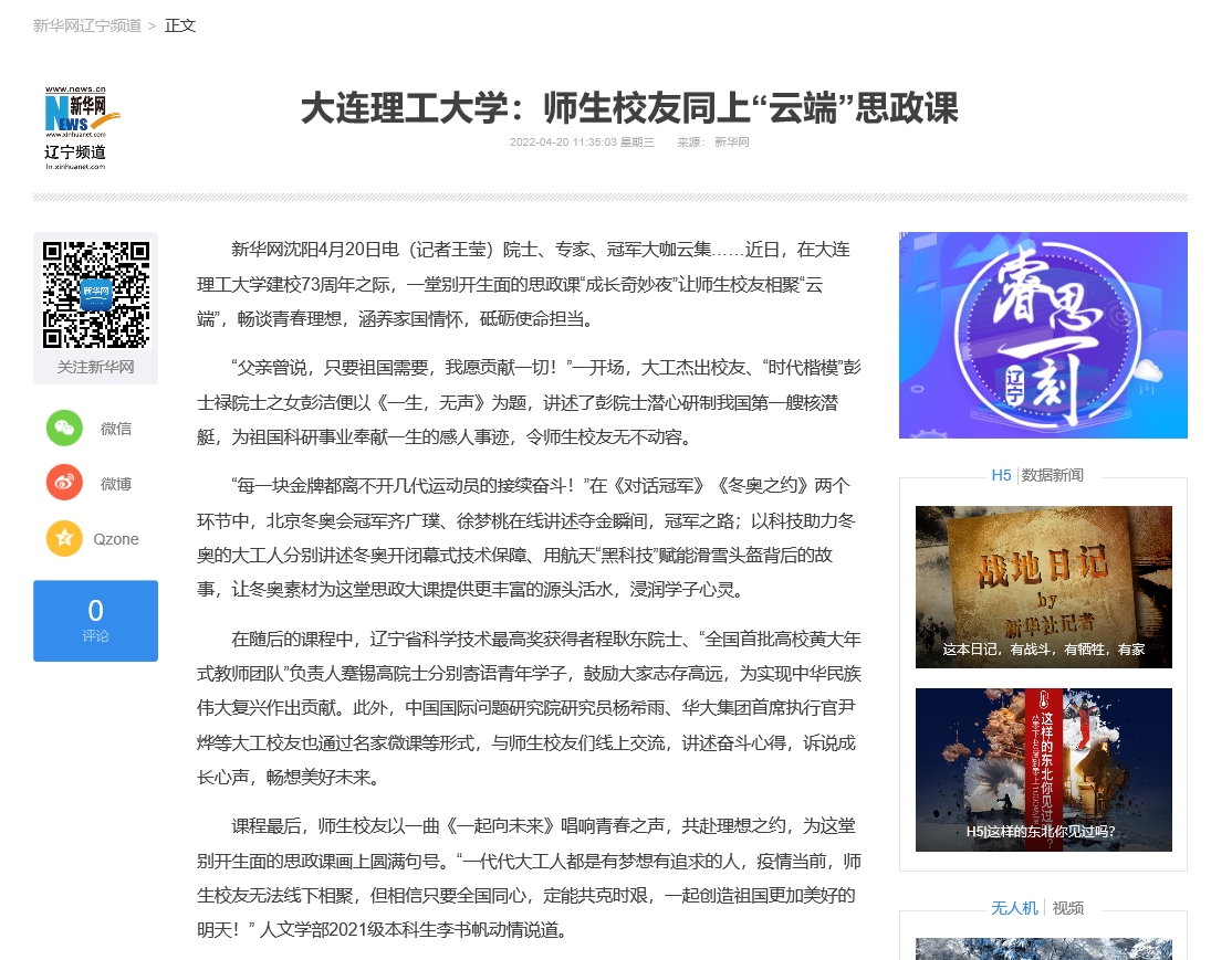 4月20日,新华网报道,大连理工大学建校73周年之际,展开线上思政课堂,师生校友相聚“云端”,讲述奋斗心得,畅谈青春理想。