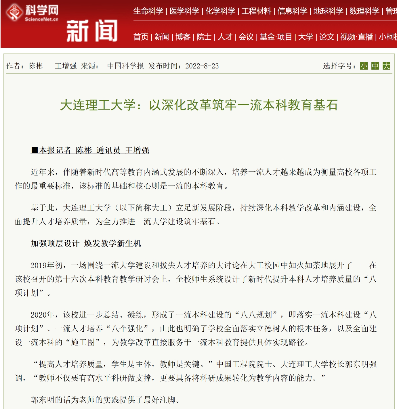 8月23日,科学网报道我校立足新发展阶段,持续深化本科教学改革和内涵建设,全面提升人才培养质量,为全力推进一流大学建设筑牢基石。
