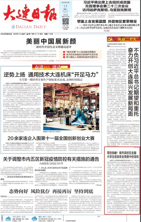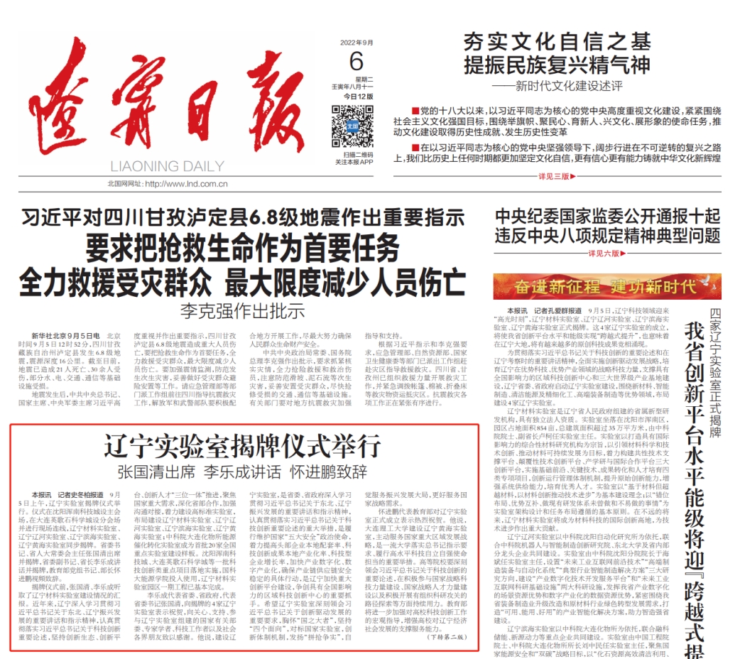 9月6日,《辽宁日报》头版报道:由我校牵头建设的辽宁实验室揭牌。