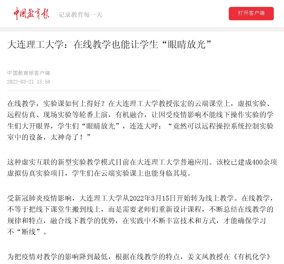 3月21日,中国教育报客户端报道了我校虚实互联的新型实验教学模式。目前,我校已建成400余项虚拟仿真实验项目,学生们在云端实验课上也能身临其境。
