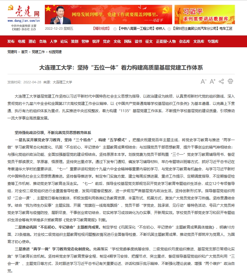 5月5日,党建网报道我校党建优秀做法:大连理工大学扎实推进中央巡视整改,着力构建“1135”基层党建工作体系,不断提升学校基层党的建设质量,引领推动一流大学事业高质量发展。