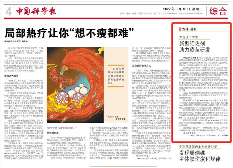 3月16日,《中国科学报》第4版报道了我校化工学院教授孙冰冰课题组成功设计并合成了表面自由能可控的羟基氧化铝纳米佐剂(AlOOH NRs),该合成物有望助力疫苗研发。