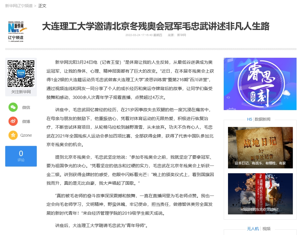 3月24日,我校邀请北京冬残奥会冠军毛忠武讲述个人的成长经历和奥运夺牌背后的故事,让同学们备受鼓舞和感动,3000余人次青年学子观看直播。新华网进行了相关报道。