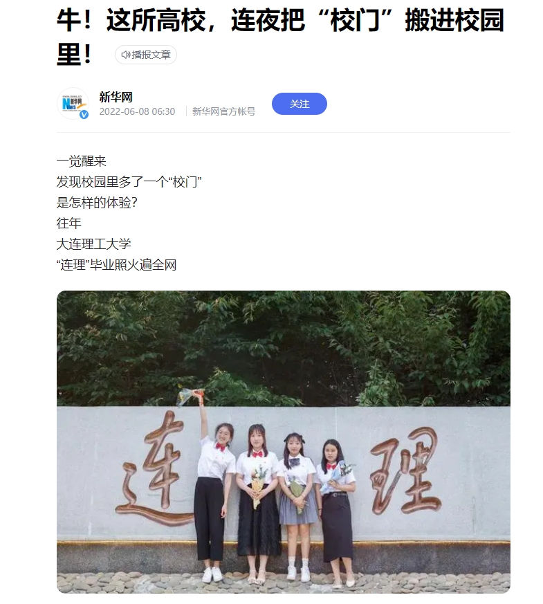为满足毕业生在疫情防控期间与校外校门“连理”合照的愿望,将“校门”搬进校园,毕业生们纷纷表示“被学校暖哭了”。该热点事件被新华网、中国青年报官微关注推介,被人民网等多家媒体报道。
