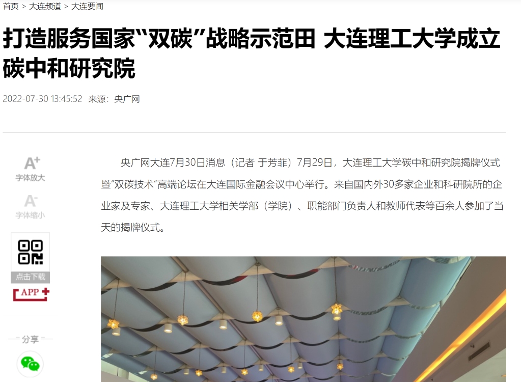 7月30日,央广网报道我校碳中和研究院揭牌仪式暨“双碳技术”高端论坛在大连国际金融会议中心举行,百余人参加了当天的揭牌仪式。