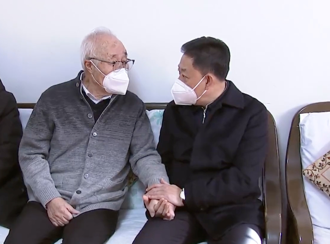 在邵春亮老师家中,胡玉亭握着邵老的手,同他促膝交谈。现已87岁的邵春亮依然扎根民族学生教育一线,30余年如一日关心关注少数民族学生成长成才。