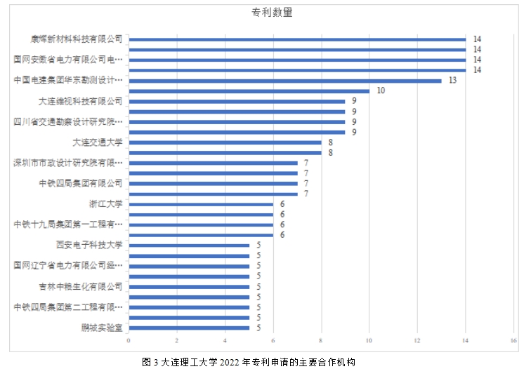 报告对2022年与大连理工大学合作进行专利申请的机构进行统计,其中合作5件及以上专利的机构及专利数量信息如图3。合作最多的机构为国家电网有限公司、国网安徽省电力有限公司电力科学研究院、山东理工大学以及康辉新材料科技有限公司,合作专利数量均为14件。