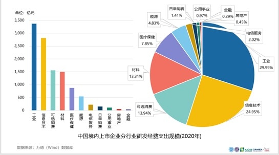 中国境内各行业上市企业研发经费规模和强度都显著提高。《报告》显示,相比于2018年,2020年企业数量最多的工业行业研发经费投入总额增加了1173.38亿元,研发强度从2.12%提升至2.50%。企业数量最少的电信服务行业研发经费投入规模从2018年的20.22亿元大幅增长至226.40亿元,研发强度也从0.67%提高至1.54%。