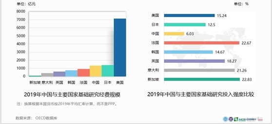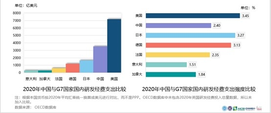 《报告》主体分为总量结构、公共部门、私人部门、基础研究经费专题四个部分,对中国研发经费投入、结构和用处等数据进行了梳理和解读。《报告》指出,2020年我国研发经费投入总量突破2.4万亿元。从总量上看,中国的研发投入经费仅次于美国,位居世界第二。但从研发投入强度方面来看,我国研发经费投入强度位于G7中游位置,并进一步接近日本和德国水平。2020年,我国研发经费投入强度为2.4%,超越法国,落后于美国、日本和德国。