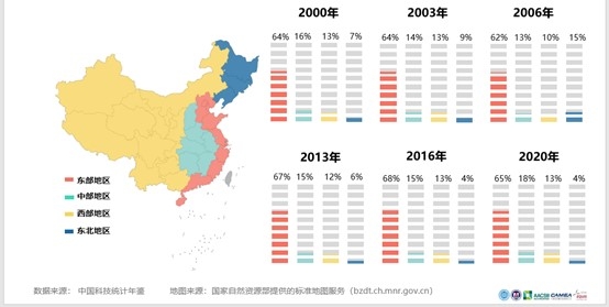 从四大板块研发经费投入情况来看,东部地区研发经费投入领先优势明显,近年来占全国的研发经费投入比重在64%至68%区间波动;中部与西部地区所占比重基本维持在15%和13%左右;而东北地区仅占4%。四大板块呈现“东部2/3”,中部地区崛起的经费配置特征。