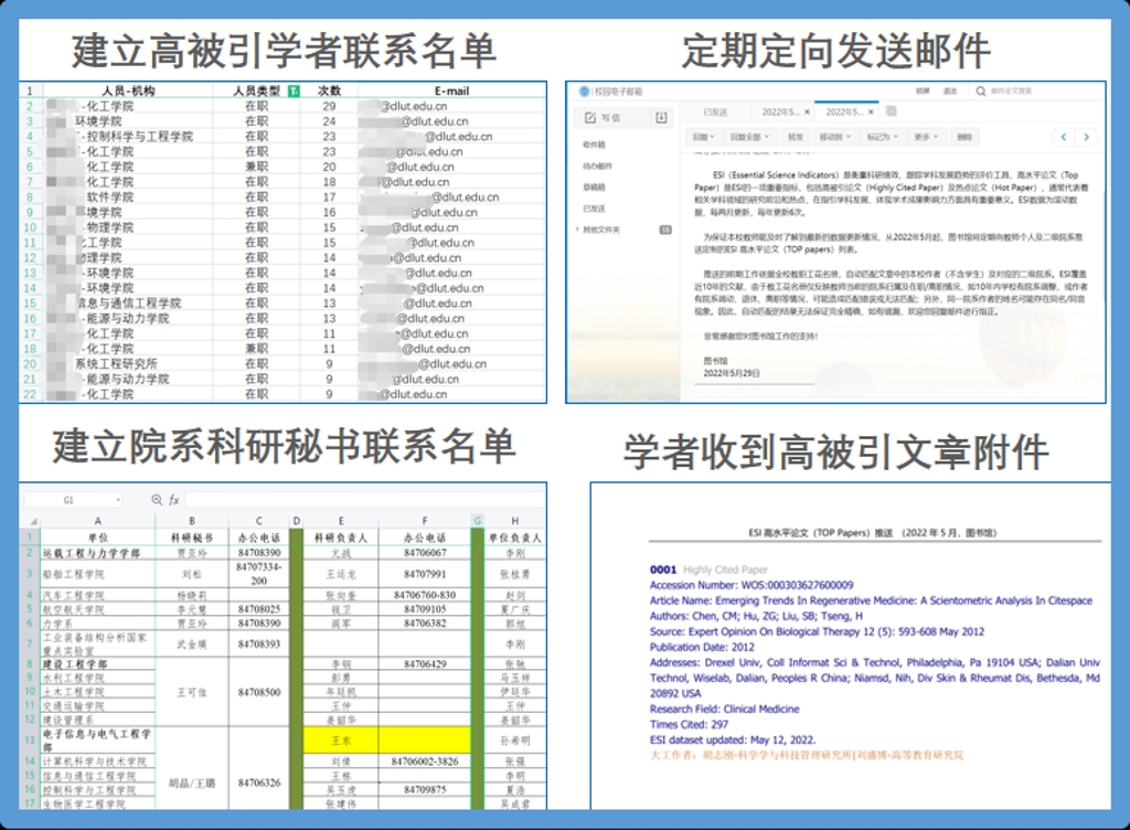 为更好践行以师生需求为导向,专业馆员靠前服务的理念,进一步助力我校“双一流”建设加速跑,自2022年5月起,图书馆每两个月将高被引/热点论文数据主动推送到校内作者信箱,以便作者本人及时获悉论文ESI最新收录信息;同时根据本校的一流学科建设实际,2018年起图书馆协同学校职能部门,定期追踪和监测本校学科在国内外400多所高校所处的位置与排名变化情况,共计32期,通过与同类国内高校(C9,E9高校)对标数据,动态展示我校学科发展态势和水平。