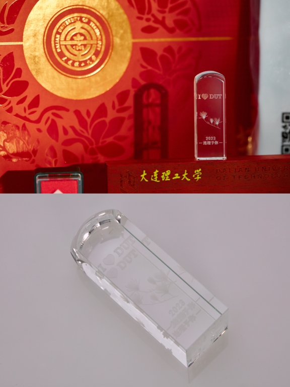 刻着姓名的专属印章、带着大工玉兰花纹、印着“2023连理予你”,专属水晶印章祝福毕业生起笔人生,刚劲有力;镌刻历史,灵动流畅;潜心静气,厚积薄发!
