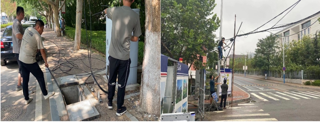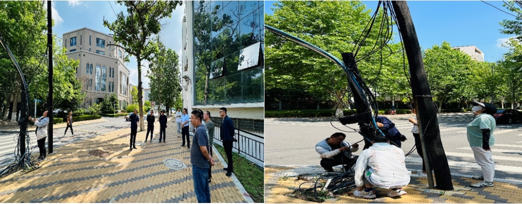 修齐路与修远路交叉路口私接乱拉光缆现象,一直以来都是校园管理中的难题,不仅影响了校园环境美观和通行秩序,也存在很大的安全隐患。架空光缆落地、消除废旧光缆,涉及校内外多家单位,需要各家通力配合与协同。6月13日,由党政办统筹,校园管理与修缮中心协同网信中心、后勤处、保卫处及大连市公安局高新园区分局、中国移动通信集团辽宁有限公司大连分公司、中国联合网络通信有限公司大连市分公司、中国铁塔股份有限公司大连分公司、中国电信股份有限公司大连分公司、大连商品交易所等校内外11家单位召开架空光缆落地现场办公会,并进行详细的论证,拟定光缆落地方案,建立光缆落地工作群。